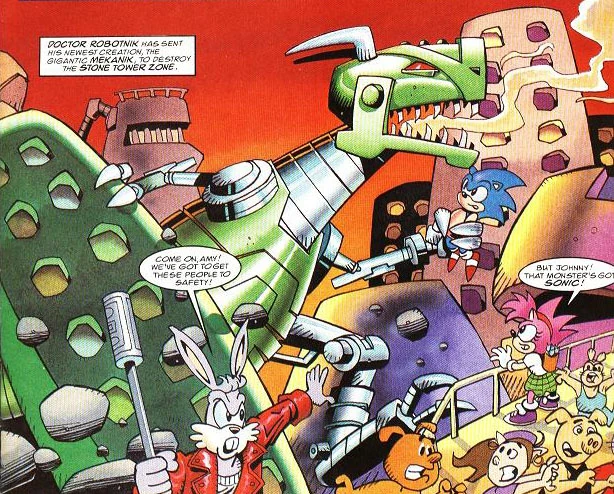 The Mekanik was deployed to the Stone Tower Zone, an area largely ignored during the course of Robotnik's rule. It rampaged through the city destroying everything in its path until it was impeded by Sonic the Hedgehog and his gang of Freedom Fighters. Sonic's attacks had no effect on the Mekanik and the battle seemed hopeless, until help arrived in the form of Shortfuse the Cybernik, a usually solo hero who had turned against Robotnik. The Mekanik tried to kill Shortfuse with its flame breath, but Shortfuse's Megatal armour protected him. Shortfuse helped Sonic defeat the Mekanik by concentrating his laser fire on the small gaps between its armour plates, heating them up and softening them. Sonic was then able to break through the weakened areas and get inside the giant robot's internal mechanics, tearing the monster apart from within.