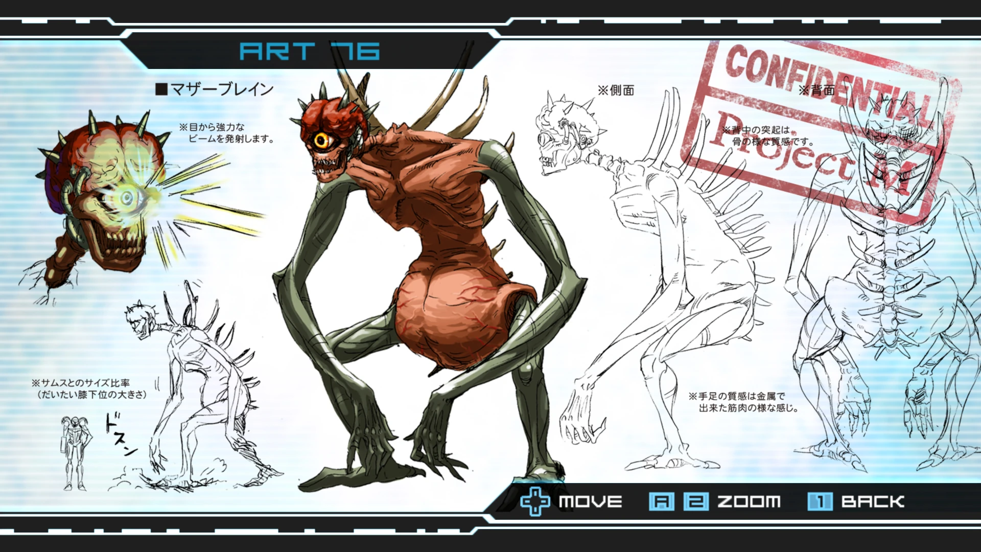 Metroid: Other M makes various changes to the depiction of Mother Brain in the beginning flashback. Firstly, she is much more skeletal than the Super Metroid version and less squat. The brain is now smaller in comparison to the body, which seems to lack the lumps present in the Super Metroid version. Her arms also seem to be longer, and her back growths appear to be slightly different.